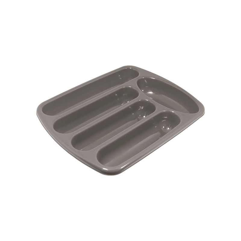 Portaposate da cassetto in PP grigio caldo. Dispone di 5 scoparti e nasce per l'organizzazione delle posate nei cassetti della cucina ma può essere utilizzato anche per i trucchi, articoli di cancelleria, utensili da lavoro come cacciaviti… Dal design basico, funzionale e resistente ti aiuterà a tenere in ordine i cassetti di tutta la casa e la pulizia sarà veloce grazie alla superficie lucida.