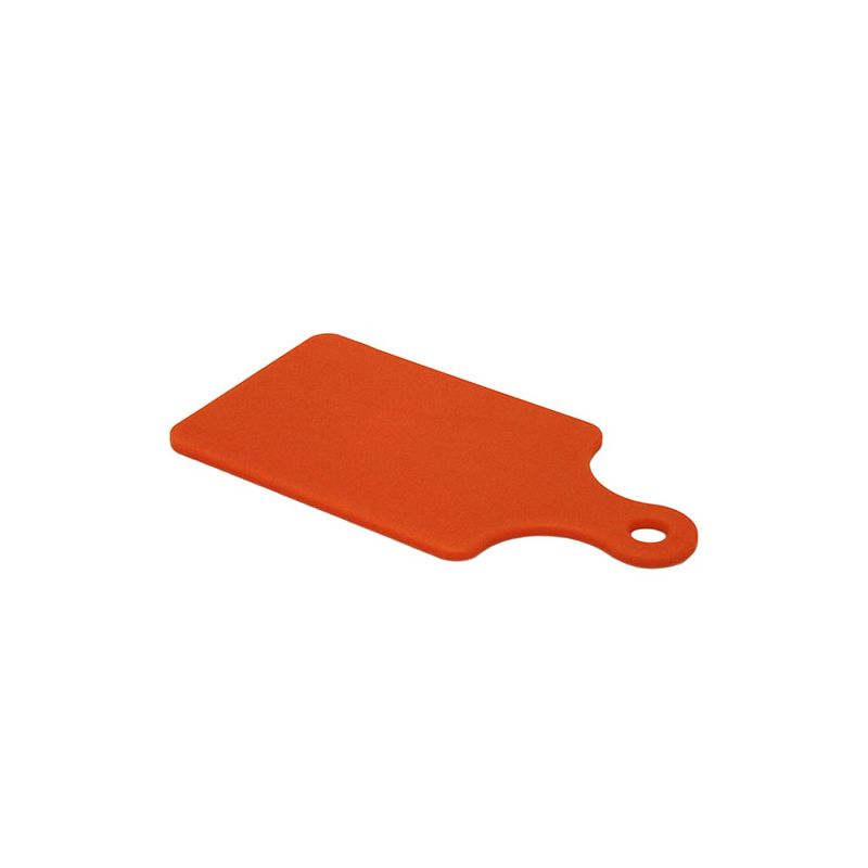 Tagliere rettangolare in PP arancio lavabile in lavastoviglie. Il grande e pratico manico forato permette di appenderlo e ne facilita l'utilizzo.