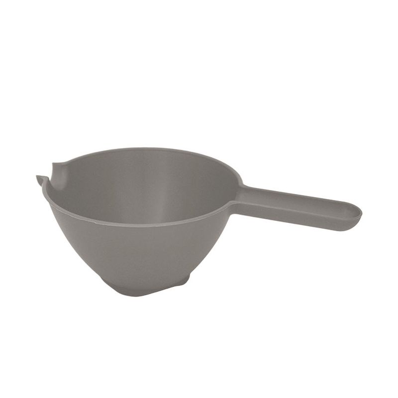 Colariso con manico in PP grigio caldo dal design pulito e funzionale. Dotato di beccuccio per versare facilmente il contenuto, è robusto e lavabile in lavastoviglie oltre che certificato per il contatto alimentare.