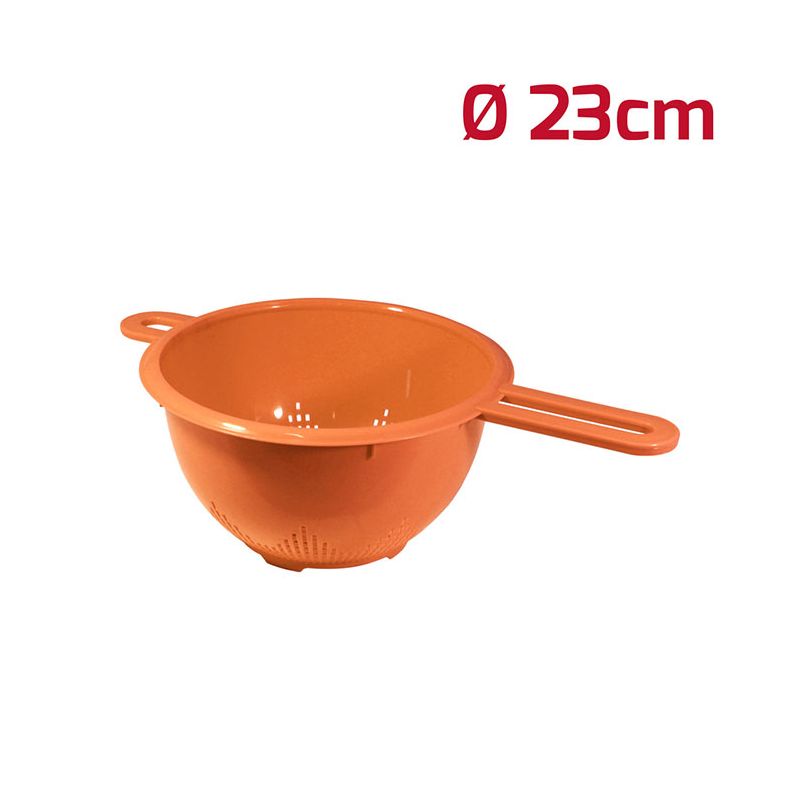 Colariso Sole con manico in PP arancio dal design semplice e funzionale. Il disegno creato dai fori ricorda un sole, caratteristica del prodotto, ed è dotato di un anello per poterlo appendere. È robusto e lavabile in lavastoviglie oltre che certificato per il contatto alimentare.