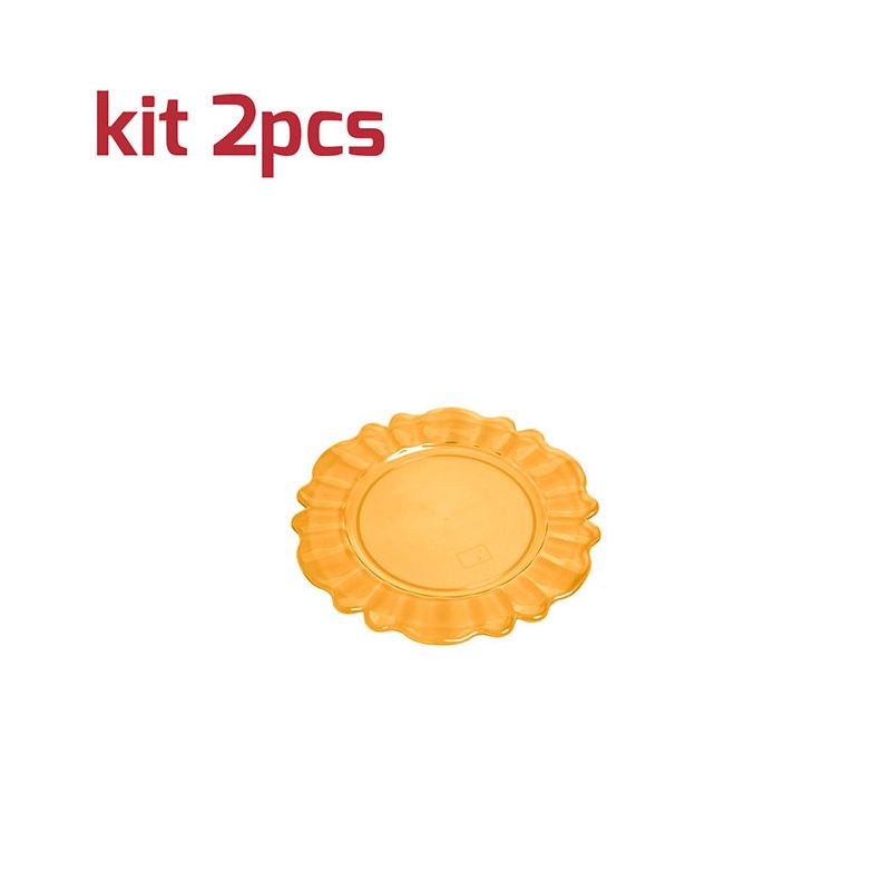 Kit di 2 sottobicchieri Nobles riutilizzabili in PS arancio trasparente. Dal design particolare è perfetto per completare la tavola con un tocco barocco ed elegante grazie all'aspetto cristallino. È certificato per il contatto alimentare e per il lavaggio in lavastoviglie.