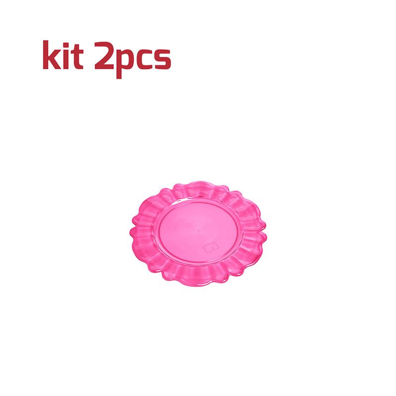Kit di 2 sottobicchieri Nobles riutilizzabili in PS fucsia trasparente. Dal design particolare è perfetto per completare la tavola con un tocco barocco ed elegante grazie all'aspetto cristallino. È certificato per il contatto alimentare e per il lavaggio in lavastoviglie.