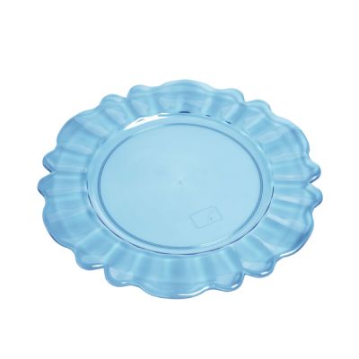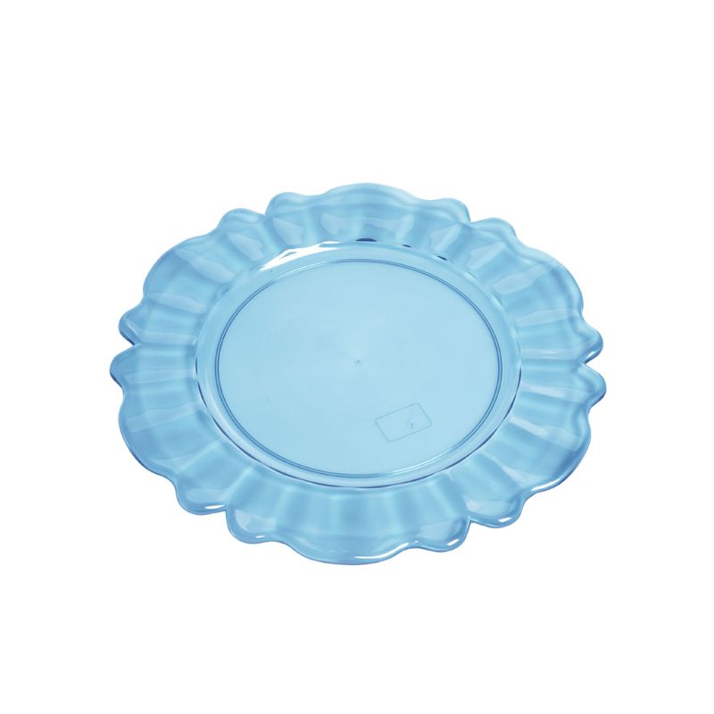 Sottopiatto Nobles in PS azzurro trasparente. Dal design particolare è perfetto per completare la tavola con un tocco barocco oppure usato come vassoio per servire dolci o caffè. È certificato per il contatto alimentare e per il lavaggio in lavastoviglie.
