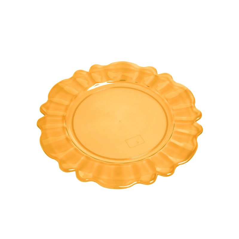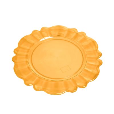 Sottopiatto Nobles in PS arancio trasparente. Dal design particolare è perfetto per completare la tavola con un tocco barocco oppure usato come vassoio per servire dolci o caffè. È certificato per il contatto alimentare e per il lavaggio in lavastoviglie.