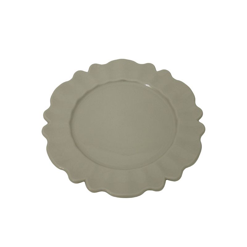 Sottopiatto Nobles in PP grigio caldo. Dal design particolare è perfetto per completare la tavola con un tocco barocco oppure usato come vassoio per servire dolci o caffè. È certificato per il contatto alimentare e per il lavaggio in lavastoviglie.