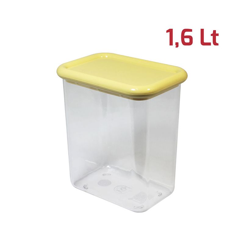 Barattolo Brio rettangolare con base in PS trasparente e tappo in PP giallo pastello. Pratico barattolo con tappo a pressione dal design rotondeggiante e indispensabile nella dispensa di casa. Sono facilmente impilabili e ideali per la conservazione degli alimenti, che siano biscotti, pasta o zucchero. Sono certificati per il contatto alimentare e lavabili in lavastoviglie.