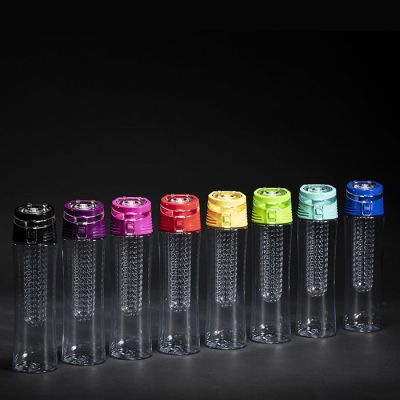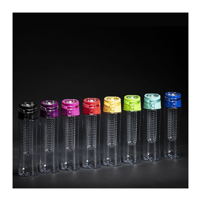 Borraccia in SAN, PP e PC con tappo in colori assortiti (blu, azzurro, verde, giallo, rosso, rosa, viola o nero). Il tappo si avvita alla base ed è dotato di ulteriore chiusura a scatto con guarnizione per il beccuccio. L'anello mobile invece permette di legare la borraccia allo zaino o al borsone oltre che semplificare il trasporto a mano. L'infusore si avvita al tappo da sotto e può essere riempito di qualsiasi alimento si preferisca. Sul retro del foglietto all'interno della borraccia ci sono alcune ricette per preparare infusi gustosissimi usando frutta, verdura o erbe aromatiche. Può essere utilizzata sia con che senza infusore ed è così adatta sia per la palestra che per l'ufficio, sia per la spiaggia che per la scuola... Realizzata con materiali resistenti, certificati per il contatto alimentare e il lavaggio in lavastoviglie, è la soluzione perfetta per contrastare l'utilizzo di plastica monouso con la possibilità di gustarsi una bevanda buona e salutare ovunque tu sia.