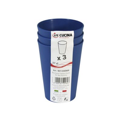 Kit di 3 bicchieri in PP azzurro da 27cl al bordo. Dal design semplice ma curato, questi bicchieri si adattano ad ogni tipo di occasione e di bevanda. Dal succo al cocktail, dal frullato alla granita. La finitura satinata della superficie esterna li rende particolari e piacevoli al tatto oltre che aumentare l’intensità del colore del bicchiere. Sono resistenti, certificati per il lavaggio in lavastoviglie, riutilizzabili, pratici e leggeri: sono perfetti per allestire una tavola allegra e colorata sia per grandi che per piccini.