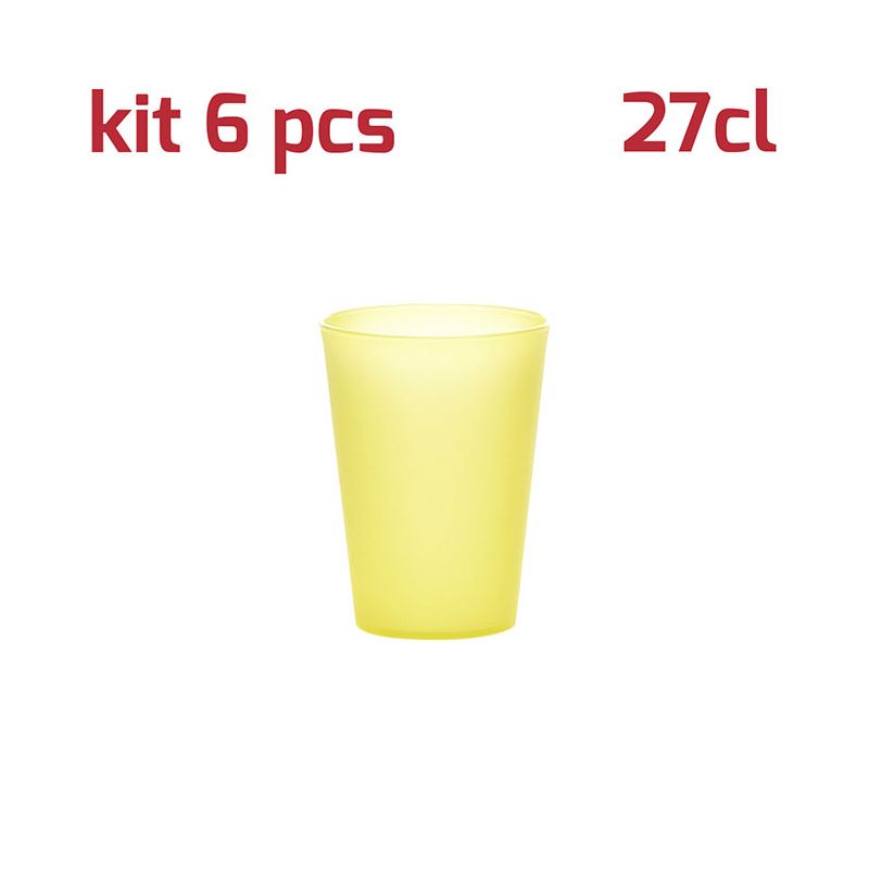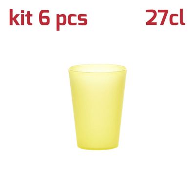 Kit di 6 bicchieri in PP giallo trasparente da 27cl al bordo. Dal design semplice ma curato, questi bicchieri si adattano ad ogni tipo di occasione e di bevanda. Dal succo al cocktail, dal frullato alla granita. La finitura satinata della superficie esterna li rende particolari e piacevoli al tatto oltre che dare la sensazione che il bicchiere sia in vetro opaco. Sono resistenti, certificati per il lavaggio in lavastoviglie, riutilizzabili, pratici e leggeri: sono perfetti per allestire una tavola allegra e colorata sia per grandi che per piccini.