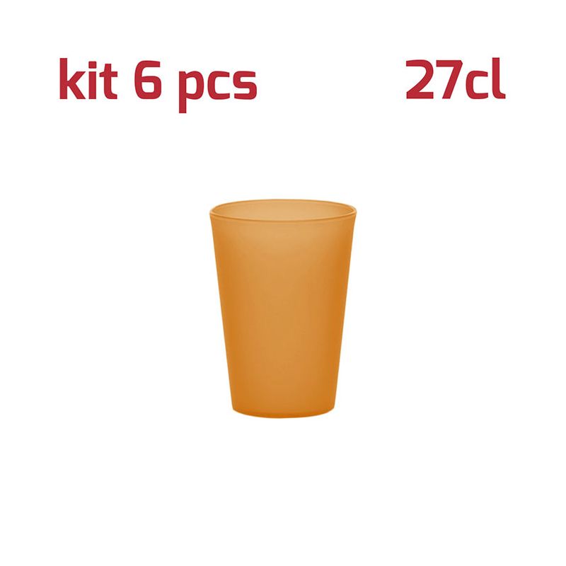 Kit di 6 bicchieri in PP arancio trasparente da 27cl al bordo. Dal design semplice ma curato, questi bicchieri si adattano ad ogni tipo di occasione e di bevanda. Dal succo al cocktail, dal frullato alla granita. La finitura satinata della superficie esterna li rende particolari e piacevoli al tatto oltre che dare la sensazione che il bicchiere sia in vetro opaco. Sono resistenti, certificati per il lavaggio in lavastoviglie, riutilizzabili, pratici e leggeri: sono perfetti per allestire una tavola allegra e colorata sia per grandi che per piccini.