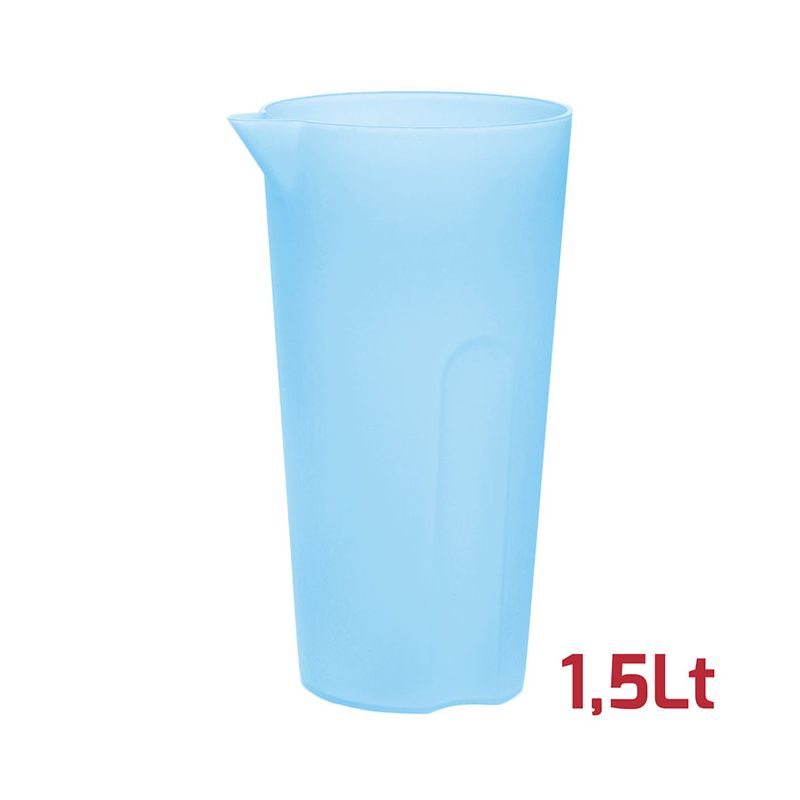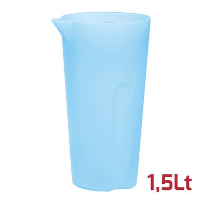 Caraffa da 1,5Lt in PP azzurro trasparente dal design semplice e funzionale lavabile in lavastoviglie. La forma ergonomica della base permette una presa salda nel versare le bevande. Non avendo il manico è impilabile e salvaspazio.