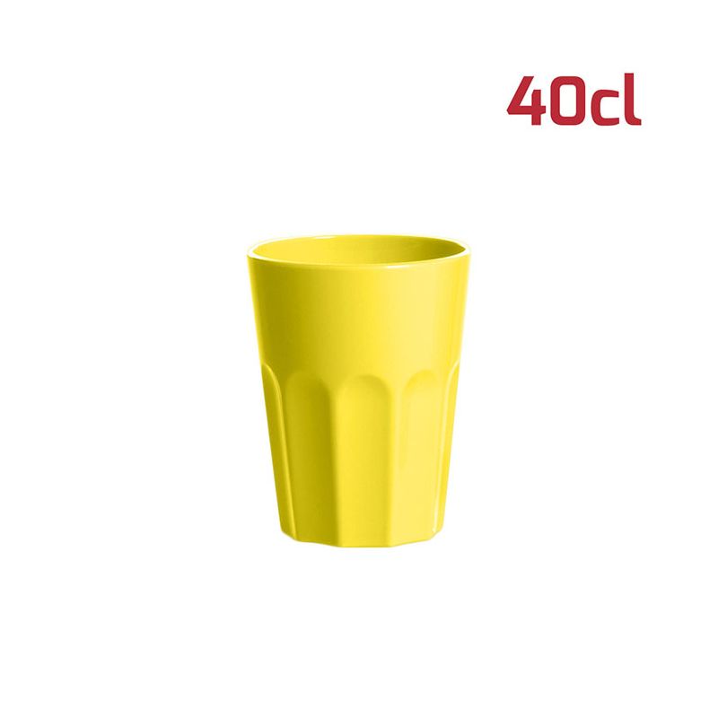 Bicchiere American in PP giallo vivo da 40cl al bordo. Il design sfaccettato in stile tumbler rende il bicchiere elegante e adatto ad ogni occasione. È particolarmente indicato per i cocktail ma si presta ad ogni tipo di bevanda, che sia alcolica o meno. È riutilizzabile e lavabile in lavastoviglie.