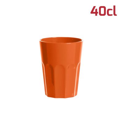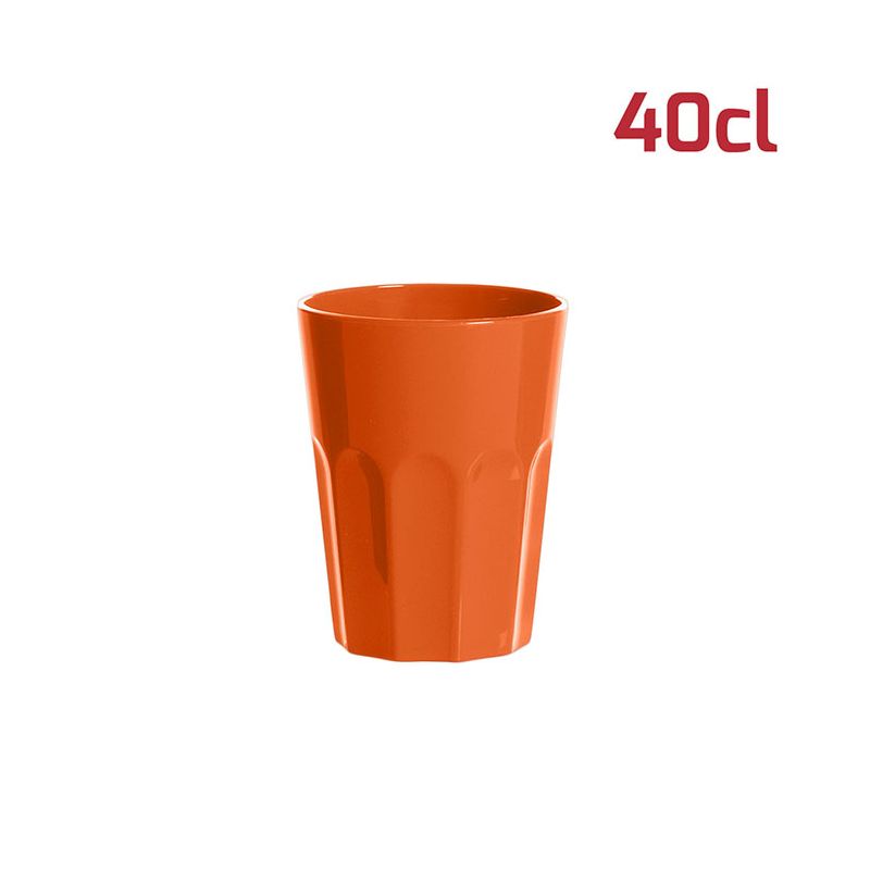 Bicchiere American in PP arancio da 40cl al bordo. Il design sfaccettato in stile tumbler rende il bicchiere elegante e adatto ad ogni occasione. È particolarmente indicato per i cocktail ma si presta ad ogni tipo di bevanda, che sia alcolica o meno. È riutilizzabile e lavabile in lavastoviglie.