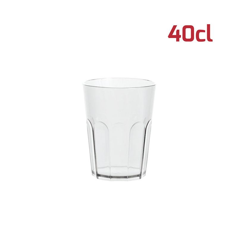 Bicchiere American in PS trasparente da 40cl al bordo. Il design sfaccettato in stile tumbler e l'aspetto cristallino rende il bicchiere elegante e adatto ad ogni occasione. È particolarmente indicato per i cocktail ma si presta ad ogni tipo di bevanda, che sia alcolica o meno. È riutilizzabile e lavabile in lavastoviglie.