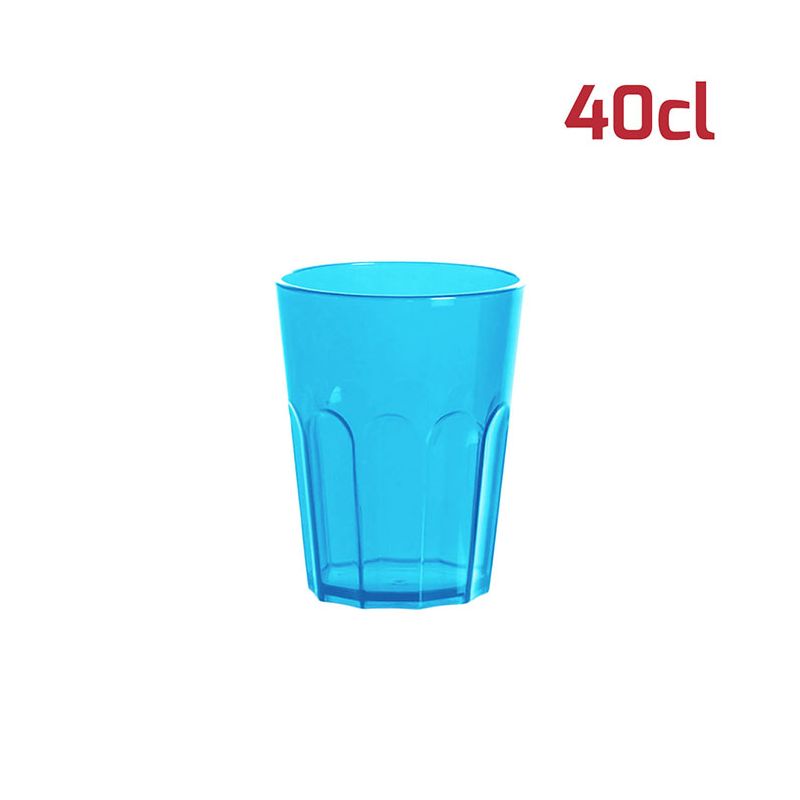 Bicchiere American in PS azzurro trasparente da 40cl al bordo. Il design sfaccettato in stile tumbler e l'aspetto cristallino rende il bicchiere elegante e adatto ad ogni occasione. È particolarmente indicato per i cocktail ma si presta ad ogni tipo di bevanda, che sia alcolica o meno. È riutilizzabile e lavabile in lavastoviglie.