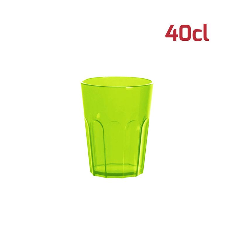 Bicchiere American in PS verde trasparente da 40cl al bordo. Il design sfaccettato in stile tumbler e l'aspetto cristallino rende il bicchiere elegante e adatto ad ogni occasione. È particolarmente indicato per i cocktail ma si presta ad ogni tipo di bevanda, che sia alcolica o meno. È riutilizzabile e lavabile in lavastoviglie.