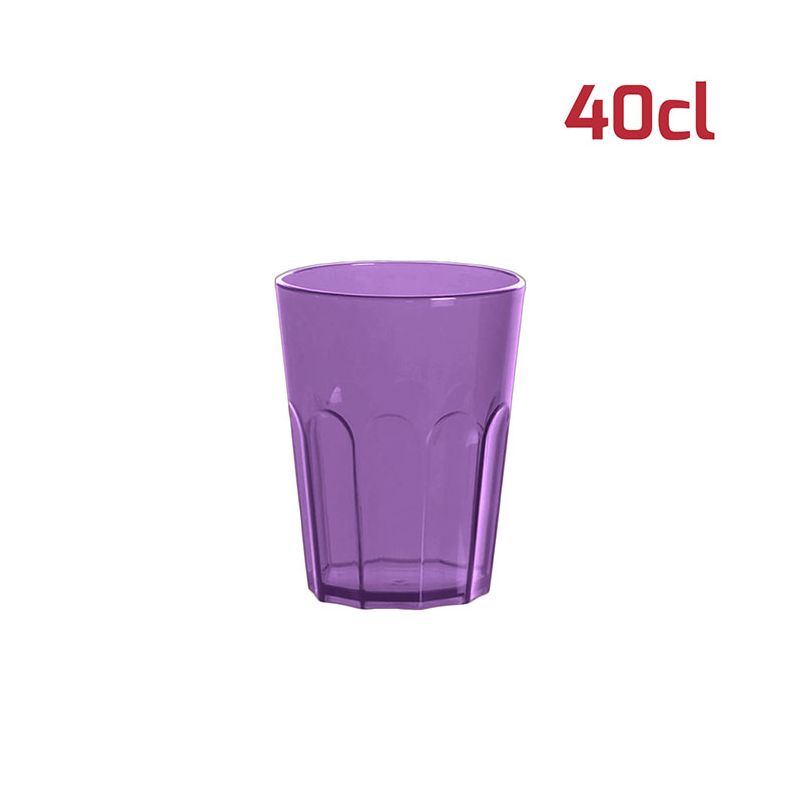 Bicchiere American in PS viola trasparente da 40cl al bordo. Il design sfaccettato in stile tumbler e l'aspetto cristallino rende il bicchiere elegante e adatto ad ogni occasione. È particolarmente indicato per i cocktail ma si presta ad ogni tipo di bevanda, che sia alcolica o meno. È riutilizzabile e lavabile in lavastoviglie.