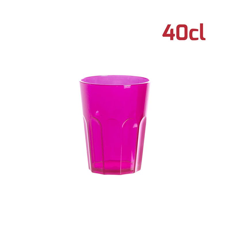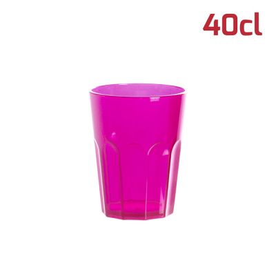 Bicchiere American in PS fucsia trasparente da 40cl al bordo. Il design sfaccettato in stile tumbler e l'aspetto cristallino rende il bicchiere elegante e adatto ad ogni occasione. È particolarmente indicato per i cocktail ma si presta ad ogni tipo di bevanda, che sia alcolica o meno. È riutilizzabile e lavabile in lavastoviglie.
