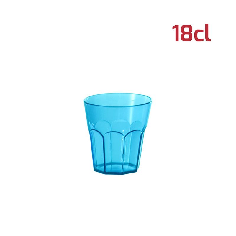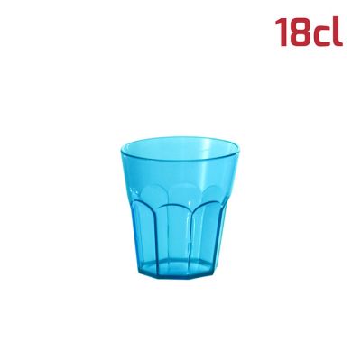 Bicchiere American in PS azzurro trasparente da 18cl al bordo. Il design sfaccettato in stile tumbler e l'aspetto cristallino rende il bicchiere elegante e adatto ad ogni occasione. È riutilizzabile e lavabile in lavastoviglie. Per le sue dimensioni si presta bene anche a gelati, macedonie o stuzzichini oltre ovviamente a tutti i tipi di bevande, sia per adulti che per i più piccoli.