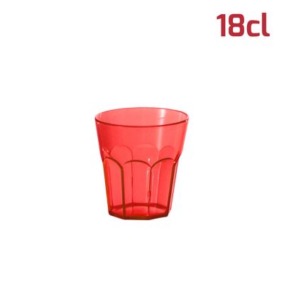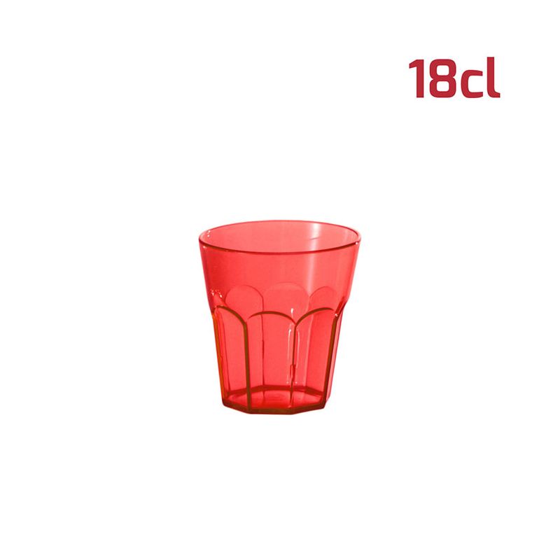 Bicchiere American in PS rosso trasparente da 18cl al bordo. Il design sfaccettato in stile tumbler e l'aspetto cristallino rende il bicchiere elegante e adatto ad ogni occasione. È riutilizzabile e lavabile in lavastoviglie. Per le sue dimensioni si presta bene anche a gelati, macedonie o stuzzichini oltre ovviamente a tutti i tipi di bevande, sia per adulti che per i più piccoli.