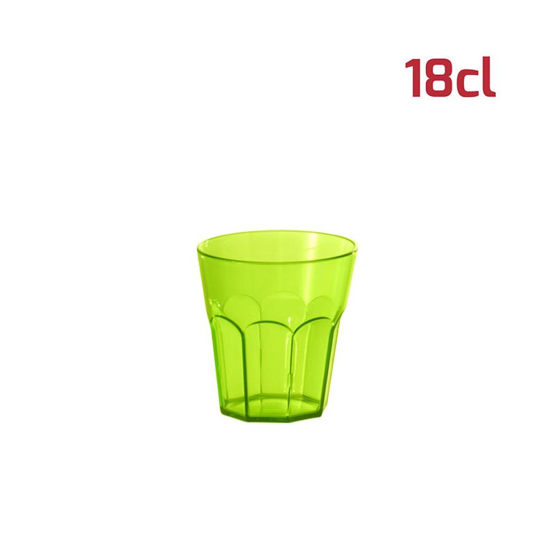 Bicchiere American in PS verde trasparente da 18cl al bordo. Il design sfaccettato in stile tumbler e l'aspetto cristallino rende il bicchiere elegante e adatto ad ogni occasione. È riutilizzabile e lavabile in lavastoviglie. Per le sue dimensioni si presta bene anche a gelati, macedonie o stuzzichini oltre ovviamente a tutti i tipi di bevande, sia per adulti che per i più piccoli.