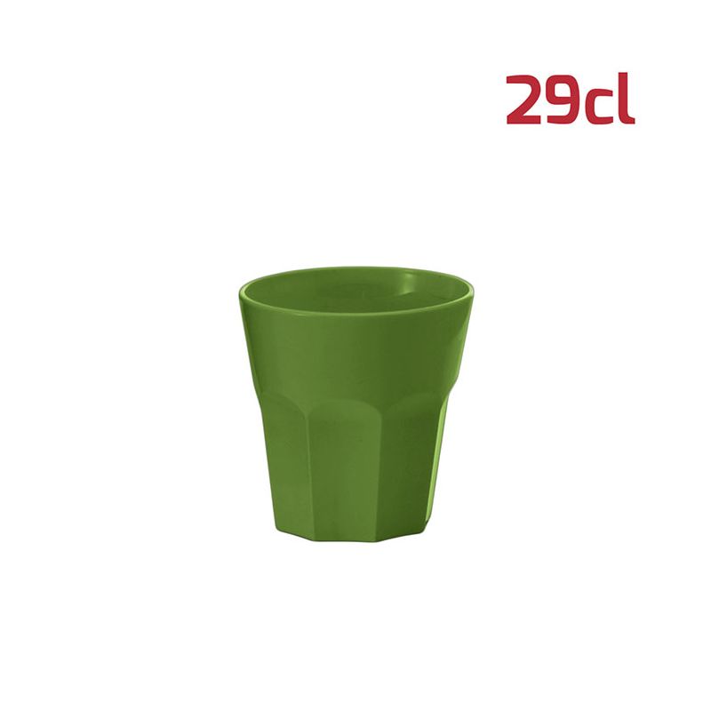 Bicchiere American in PP verde oliva da 29cl al bordo. Il design sfaccettato in stile tumbler rende il bicchiere elegante e adatto ad ogni occasione. Per le sue dimensioni si presta bene anche a gelati, macedonie o stuzzichini oltre ovviamente a tutti i tipi di bevande. È riutilizzabile e lavabile in lavastoviglie.