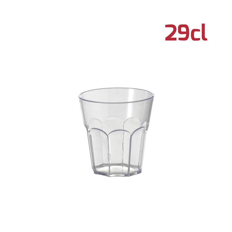 Bicchiere American in PS trasparente da 29cl al bordo. Il design sfaccettato in stile tumbler e l'aspetto cristallino rende il bicchiere elegante e adatto ad ogni occasione. Per le sue dimensioni si presta bene anche a gelati, macedonie o stuzzichini oltre ovviamente a tutti i tipi di bevande. È riutilizzabile e lavabile in lavastoviglie.