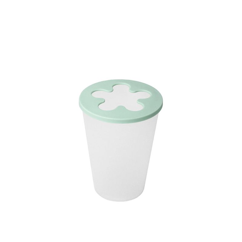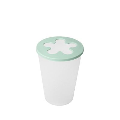 Portaspazzolini da denti in PP trasparente con coperchio verde salvia. La sagoma del coperchio ricorda un fiore e i 5 "petali" evitano che gli spazzolini si tocchino tra loro. Per svuotare la base da eventuale accumolo di acqua basta togliere il coperchio ad incastro. Per un'igiene perfetta può essere lavato in lavastoviglie.