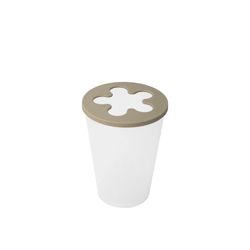 Portaspazzolini da denti in PP trasparente con coperchio beige. La sagoma del coperchio ricorda un fiore e i 5 "petali" evitano che gli spazzolini si tocchino tra loro. Per svuotare la base da eventuale accumolo di acqua basta togliere il coperchio ad incastro. Per un'igiene perfetta può essere lavato in lavastoviglie.
