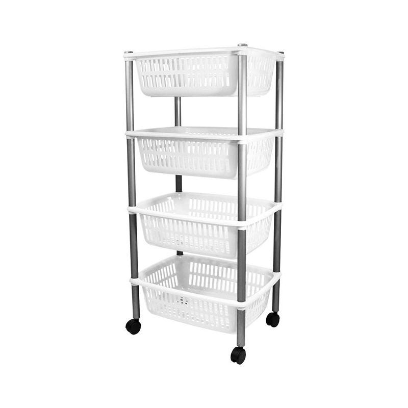 Carrello con 4 ripiani in PP bianco ghiaccio. Pratico mobiletto con ruote che permette di sfruttare al massimo gli spazi: può essere utile in cucina, in garage, in soffitta o in cantina. Utile per organizzare cibi e bevande, dalla frutta alle bottiglie di vino, ma anche utensili o giocattoli. La superficie lucida assicura una pulizia veloce e il montaggio è semplice grazie al kit e le istruzioni incluse nella confezione (non necessita di viti o altri accessori).