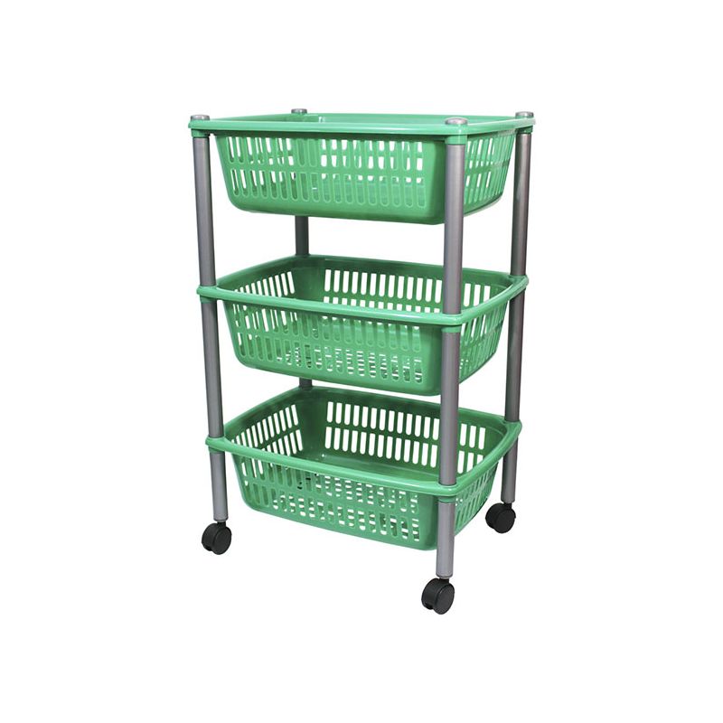 Carrello con 3 ripiani in PP verde scuro. Pratico mobiletto con ruote che permette di sfruttare al massimo gli spazi: può essere utile in cucina, in garage, in soffitta o in cantina. Utile per organizzare cibi e bevande, dalla frutta alle bottiglie di vino, ma anche utensili o giocattoli. La superficie lucida assicura una pulizia veloce e il montaggio è semplice grazie al kit e le istruzioni incluse nella confezione (non necessita di viti o altri accessori).