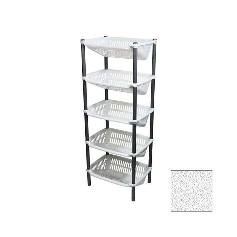 Cantinetta con 5 ripiani obliqui in PP bianco marmo. Pratico mobiletto che permette di sfruttare al massimo gli spazi: può essere utile in cucina, in garage, in soffitta o in cantina. Utile per organizzare cibi e bevande, dalla frutta alle bottiglie di vino, ma anche scarpe, utensili o giocattoli. La superficie lucida assicura una pulizia veloce e il montaggio è semplice grazie al kit e le istruzioni incluse nella confezione (non necessita di viti o altri accessori).