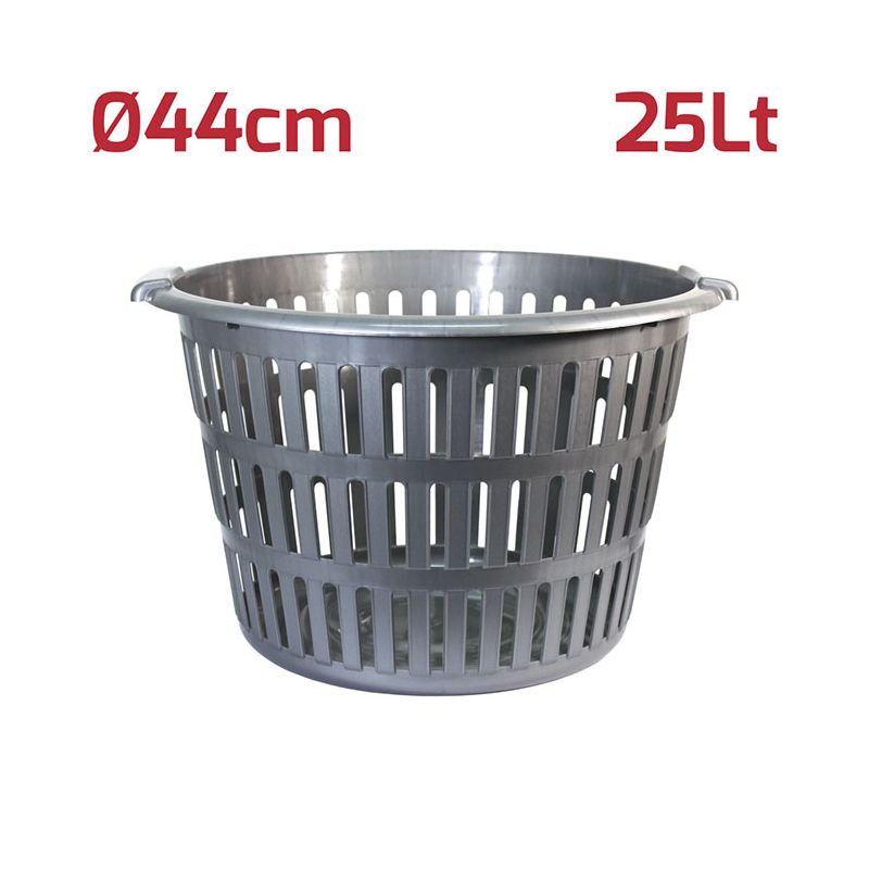 Cesta portabiancheria rotonda in PP silver. Ideale per il bucato, la cesta ha delle comode maniglie che ne agevolano l'uso e le pareti forate la rendono leggera ma molto robusta. Può essere usata comodamente anche per la cura del giardino o dell'orto grazie a materiali di alta qualità e resistenza. La superficie lucida invece semplifica la pulizia del prodotto.