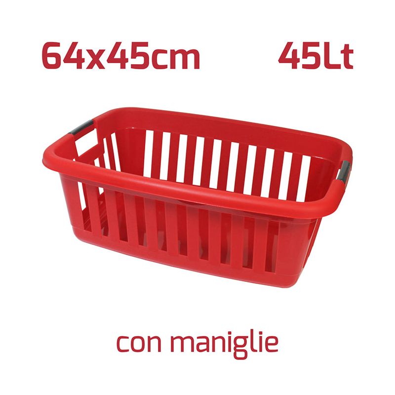 Cesta portabiancheria rettangolare Athena in PP rosso brillante. Ideale per il bucato, la cesta è dotata di maniglie che ne agevolano l'uso e le pareti forate la rendono leggera ma molto robusta. Può essere usata comodamente anche per la cura del giardino o dell'orto grazie a materiali di alta qualità e resistenza. La superficie esterna satinata dà al prodotto un'aspetto elegante e moderno mentre all'interno la superficie è lucida così da semplificare la pulizia del prodotto.