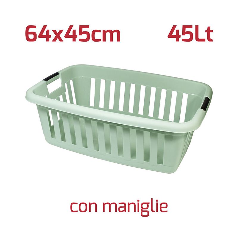 Cesta portabiancheria rettangolare Athena in PP verde salvia. Ideale per il bucato, la cesta è dotata di maniglie che ne agevolano l'uso e le pareti forate la rendono leggera ma molto robusta. Può essere usata comodamente anche per la cura del giardino o dell'orto grazie a materiali di alta qualità e resistenza. La superficie esterna satinata dà al prodotto un'aspetto elegante e moderno mentre all'interno la superficie è lucida così da semplificare la pulizia del prodotto.