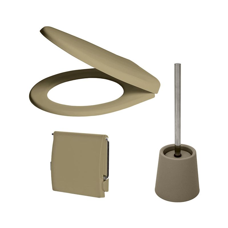Kit di 3 accessori per il bagno in PP beige composto da un sedile wc, un portarotolo e un portascopino. /