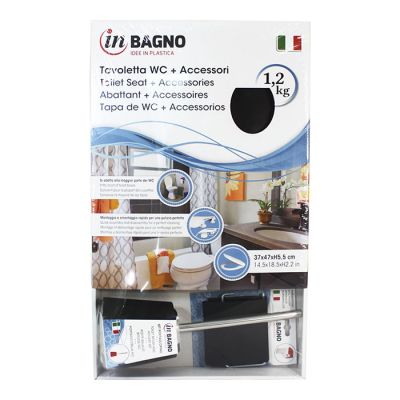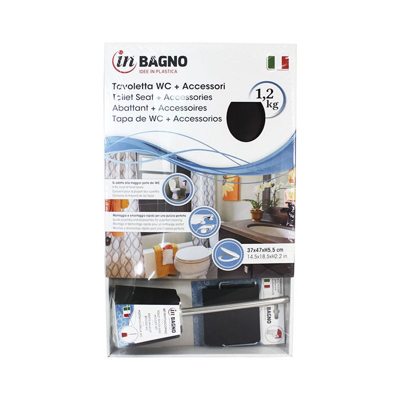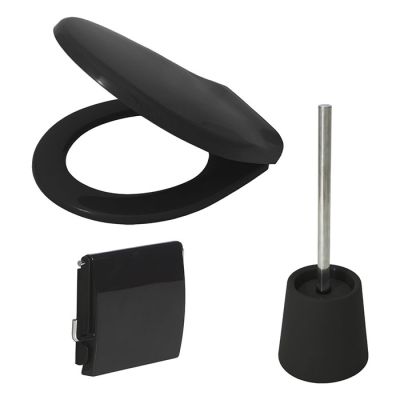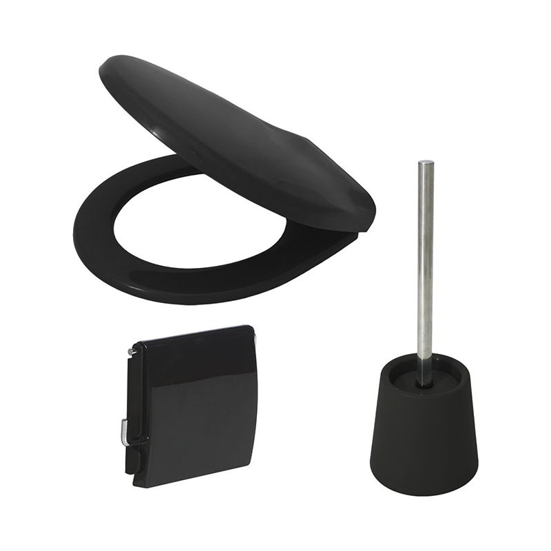 Kit di 3 accessori per il bagno in PP nero composto da un sedile wc, un portarotolo e un portascopino. /