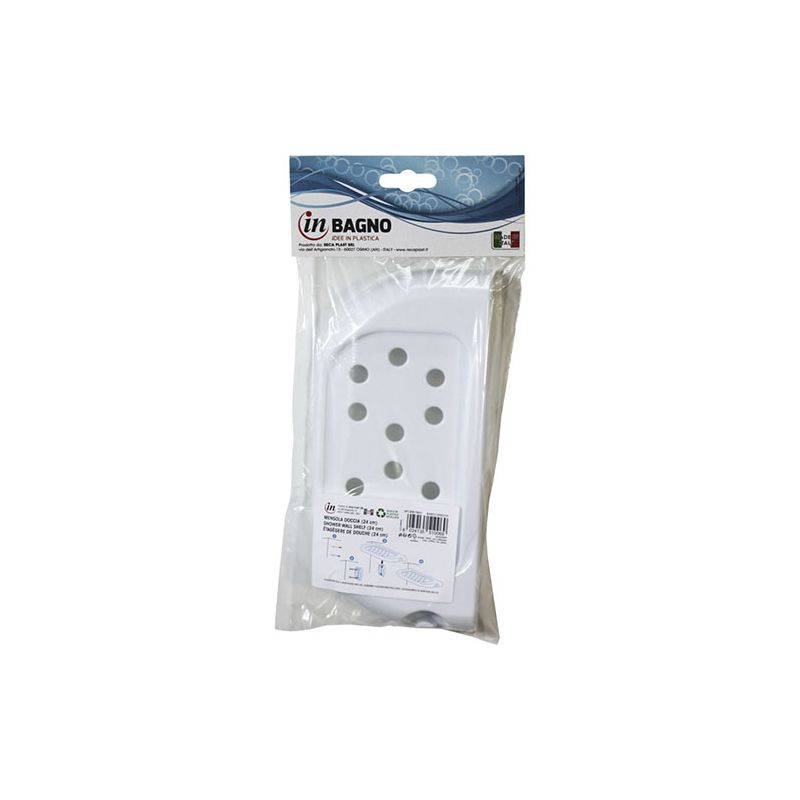 Mensola per doccia in PS antiurto bianco. Ideale per sfruttare al massimo lo spazio all'interno della doccia e tenere organizzati shampoo e saponi. Il fondo è forato per far defluire l'acqua ed è dotato di un gancio per poter appendere spugne o altri accessori. La mensola può essere facilmente smontata e rimontata per una pulizia completa. Il materiale plastico di cui è composta riduce al minimo la visibilità dei residui di calcare e rende la pulizia facile e veloce in quanto non è necessario utilizzare detergenti specifici per superfici cromate. Il montaggio a muro con le viti rende la mensola stabile e grazie al materiale antiurto sarà durevole nel tempo. Le istruzioni e il kit per il montaggio a muro sono inclusi nella confezione.