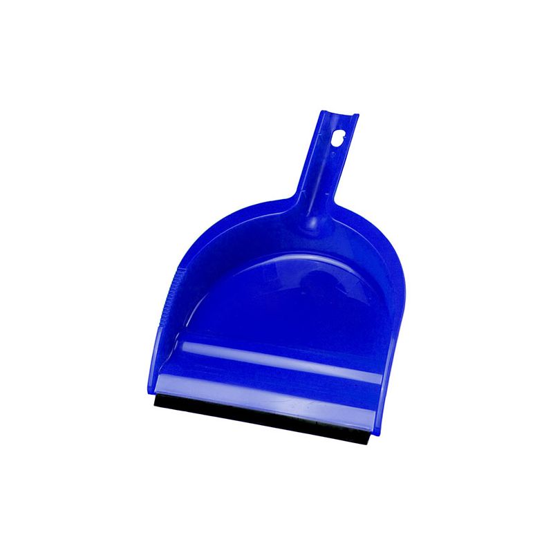 Paletta alzaimmondizia con manico tondo in PP blu e profilo in gomma. Realizzata in materiale resistente e facile da pulire la paletta presenta una zigrinatura per la pulizia delle setole della scopa e un foro sul manico per poterla appendere. Può essere attaccata all'asta della scopa grazie alla forma del manico e dalle sporgenze su di esso.