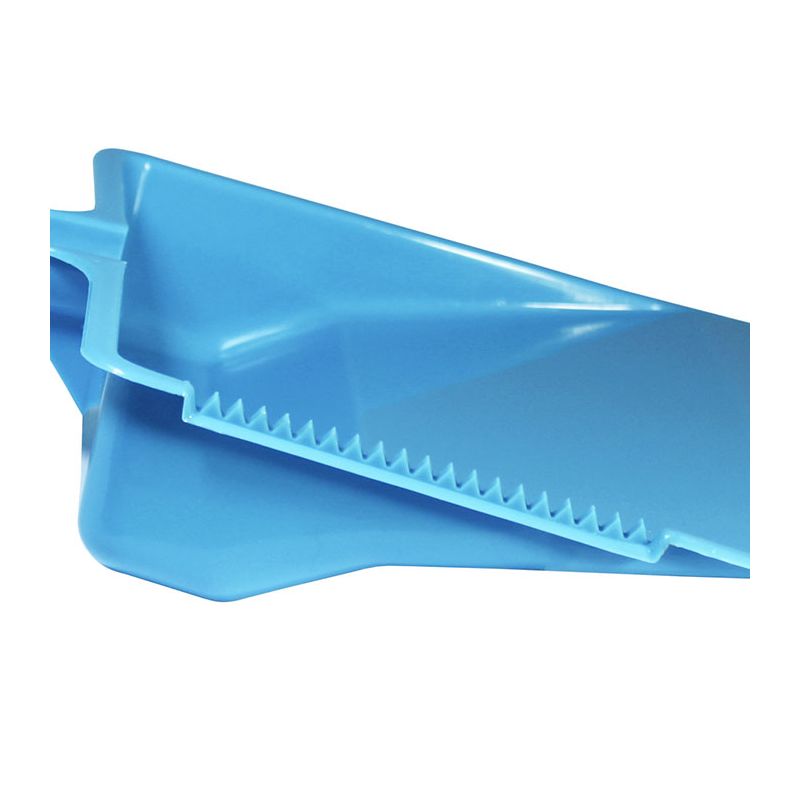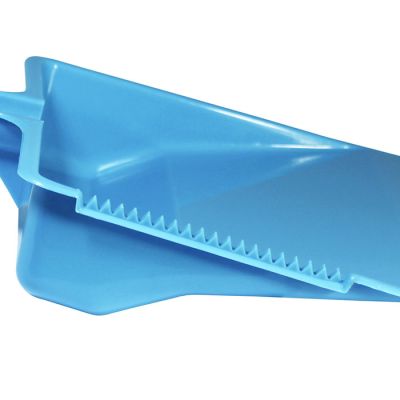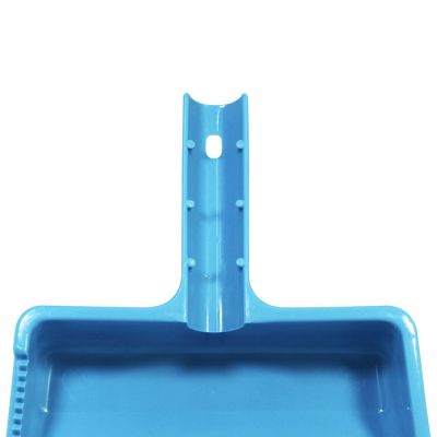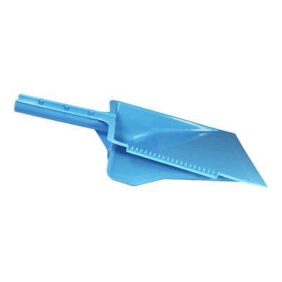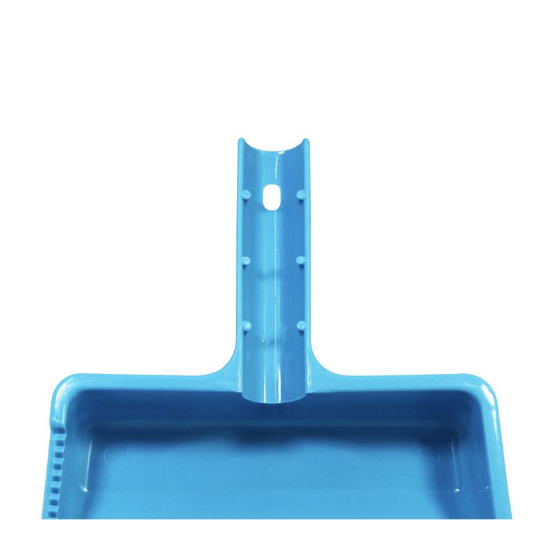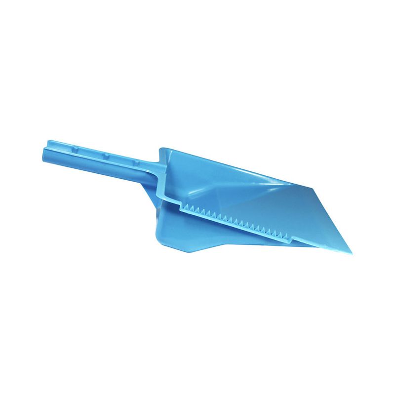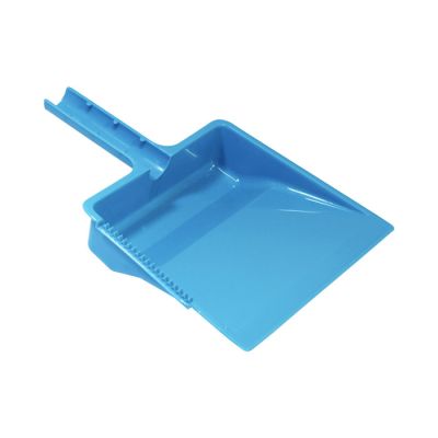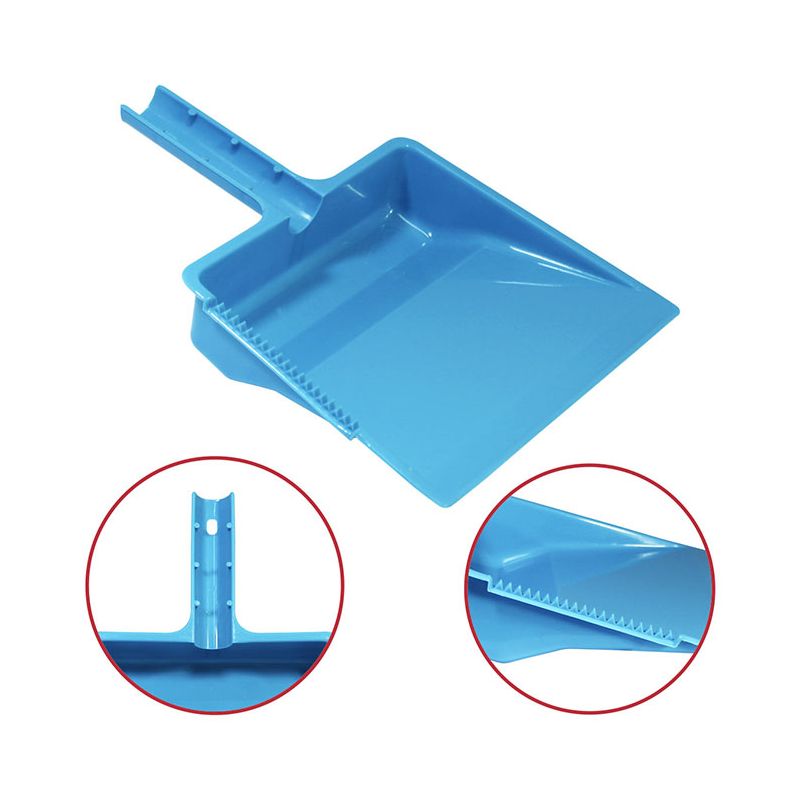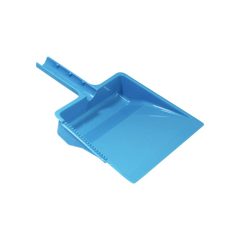Paletta alzaimmondizia con manico tondo in PP celeste. Realizzata in materiale resistente e facile da pulire la paletta presenta una zigrinatura per la pulizia delle setole della scopa e un foro sul manico per poterla appendere. Può essere attaccata all'asta della scopa grazie alla forma del manico e dalle sporgenze su di esso. Il suo design permette di contenere la sporcizia raccolta nella zona vicino al manico così da non rischiare che ricada a terra.