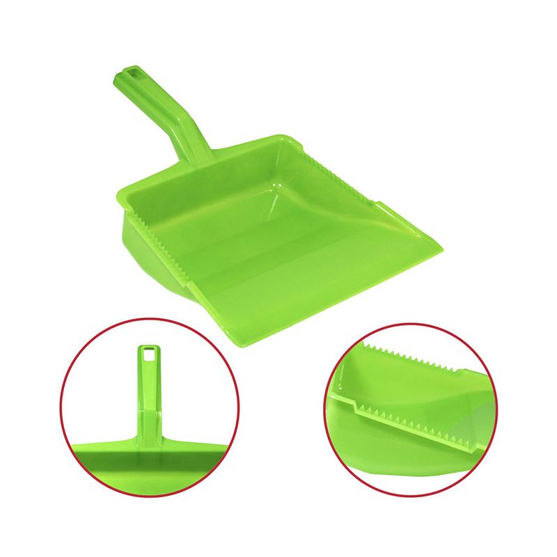 Paletta alzaimmondizia con manico ergonomico squadrato in PP verde brillante. Realizzata in materiale resistente e facile da pulire la paletta presenta una doppia zigrinatura per la pulizia delle setole della scopa e un foro sul manico per poterla appendere. Il suo design permette di contenere la sporcizia raccolta nella zona vicino al manico così da non rischiare che ricada a terra.