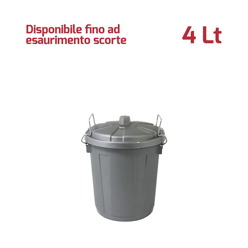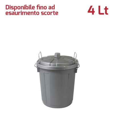 Bidone Mini 4Lt con coperchio in PP argento e chiusure in metallo. Pratico bidone utile sia in ambienti professionali che domestici e adatto sia all'uso esterno che interno: ideale per la spazzatura, per la cura dell'orto o del giardino. Le chiusure in metallo assicurano che i rifiuti e gli odori rimangano all'interno e fungono anche da maniglie per facilitare il trasporto del bidone. Il materiale in cui è realizzato rende il bidone resistente, duraturo e facile da pulire grazie alla superficie lucida. Grazie alla vasta gamma di colori e le diverse capacità sono ideali anche per la raccolta differenziata.