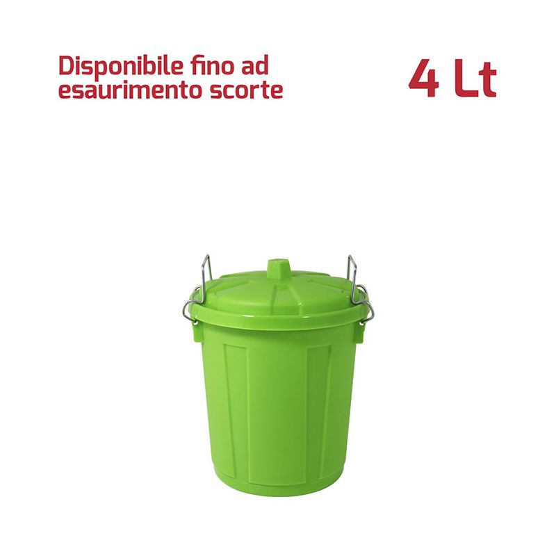 Bidone Mini 4Lt con coperchio in PP verde e chiusure in metallo. Pratico bidone utile sia in ambienti professionali che domestici e adatto sia all'uso esterno che interno: ideale per la spazzatura, per la cura dell'orto o del giardino. Le chiusure in metallo assicurano che i rifiuti e gli odori rimangano all'interno e fungono anche da maniglie per facilitare il trasporto del bidone. Il materiale in cui è realizzato rende il bidone resistente, duraturo e facile da pulire grazie alla superficie lucida. Grazie alla vasta gamma di colori e le diverse capacità sono ideali anche per la raccolta differenziata.