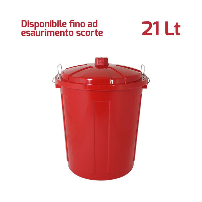 Bidone Maxi 21Lt con coperchio in PP rosso e chiusure in metallo. Pratico bidone utile sia in ambienti professionali che domestici e adatto sia all'uso esterno che interno: ideale per la spazzatura, per la cura dell'orto o del giardino. Le chiusure in metallo assicurano che i rifiuti e gli odori rimangano all'interno e fungono anche da maniglie per facilitare il trasporto del bidone. Il materiale in cui è realizzato rende il bidone resistente, duraturo e facile da pulire grazie alla superficie lucida. Grazie alla vasta gamma di colori e le diverse capacità sono ideali anche per la raccolta differenziata.
