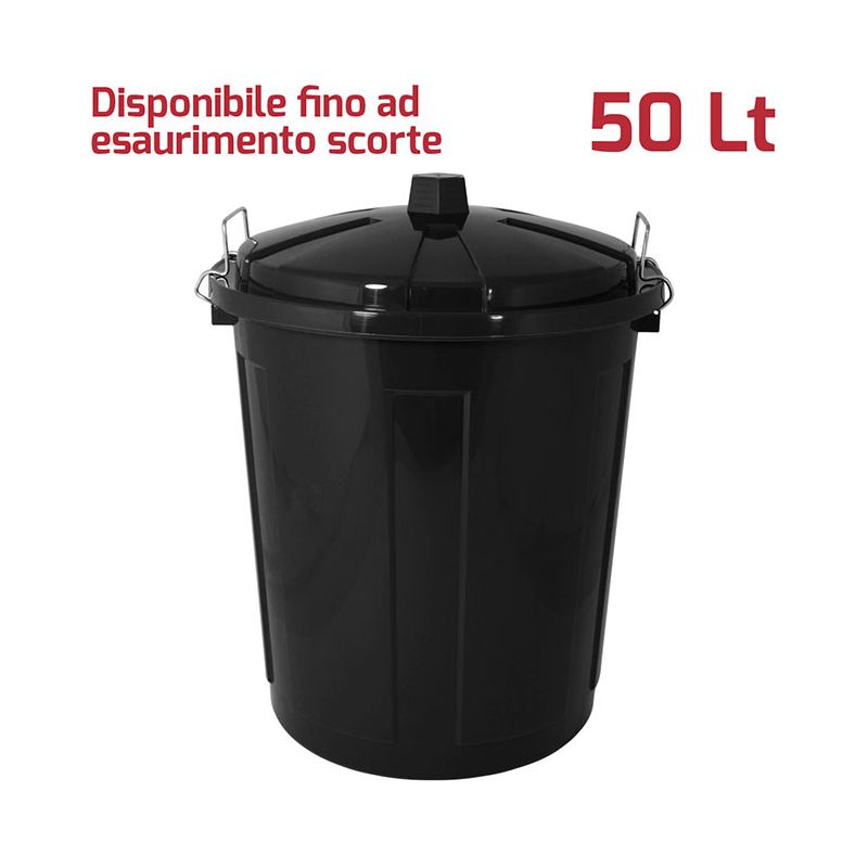 Bidone Big 50Lt con coperchio in PP nero e chiusure in metallo. Pratico bidone utile sia in ambienti professionali che domestici e adatto sia all'uso esterno che interno: ideale per la spazzatura, per la cura dell'orto o del giardino. Le chiusure in metallo assicurano che i rifiuti e gli odori rimangano all'interno e fungono anche da maniglie per facilitare il trasporto del bidone. Il materiale in cui è realizzato rende il bidone resistente, duraturo e facile da pulire grazie alla superficie lucida. Grazie alla vasta gamma di colori e le diverse capacità sono ideali anche per la raccolta differenziata.
