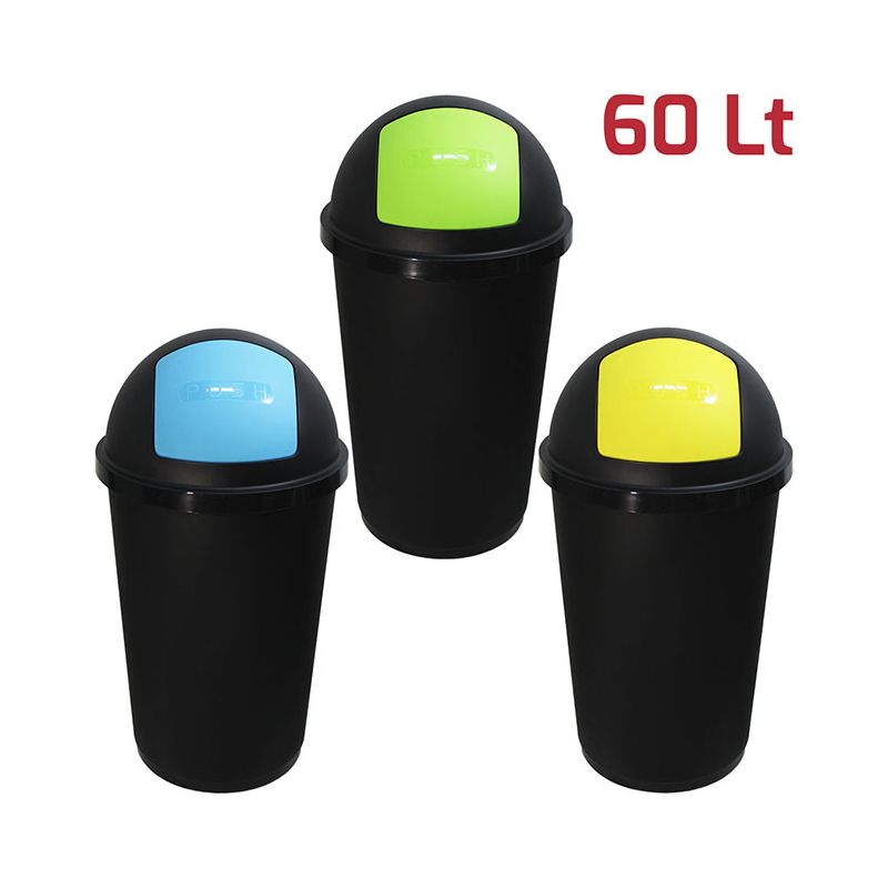 Kit per la raccolta differenziata in PP composto da 3 bidoni da 60lt neri con battola colorata per diversificare l’immondizia. Caratteristica principe del prodotto è la comoda e pratica apertura push con chiusura automatica a 2 molle della battola che fanno in modo che si richiuda sempre perfettamente e che i cattivi odori rimangano all'interno. Hanno un design pulito e semplice reso moderno dalla finitura satinata della superficie esterna. All’interno invece la finitura lucida permette una perfetta pulizia del bidone. Sono robusti, stabili, duraturi e si adattano sia ad ambienti professionali che domestici, sia interni che esterni.