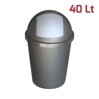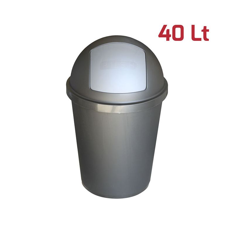Bidone Zeuss da 40Lt in PP antracite e battola push argento. Caratteristica principe del prodotto è la comoda e pratica apertura push con chiusura automatica. La battola ha ben 2 molle che fanno in modo che si richiuda sempre perfettamente e che i cattivi odori rimangano all'interno. Il design pulito e semplice è reso moderno dalla finitura satinata della superficie esterna. All’interno invece la finitura lucida permette una perfetta pulizia del bidone. Il materiale in cui è realizzato lo rende robusto, stabile, duraturo e si adatta sia ad ambienti professionali che domestici, sia interni che esterni.