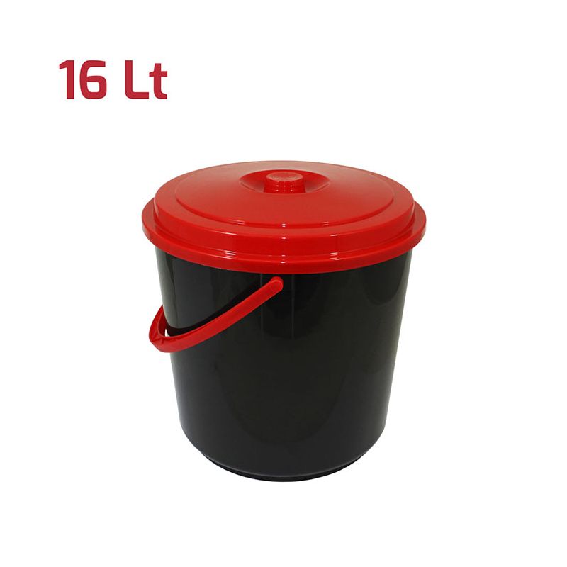 Bidone in PP nero con manico e coperchio rosso. Pratico bidone da 16Lt ideale per la spazzatura ma può essere utilizzato anche per le pulizie o come semplice contenitore per la casa, il garage, il giardino o anche per i giocattoli. Utile sia in ambienti domestici che professionali, si presta bene per la raccolta differenziata dell'immondizia grazie agli svariati colori in gamma. Il manico permette di spostare il secchio con estrema facilità e la superficie lucida del prodotto ne semplifica la pulizia.