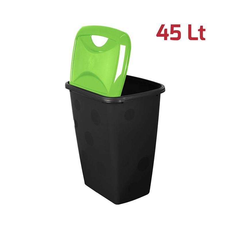 Pattumiere Bubble 45Lt in PP nero con coperchio verde. Realizzata in materiale resistente e facile da pulire, è consigliata per l'uso interno in ambienti sia professionali che domestici. La superficie esterna della base ha un simpatico decoro a bolli che rende il prodotto originale e adatto a qualsiasi ambiente. Il coperchio si solleva manualmente grazie all'apertura presente su di esso che può essere comodamente utilizzata anche come maniglia per agevolare lo spostamento del bidone. L'ampia capacità rende questa pattumiera ideale per i rifiuti voluminosi come carta, plastica o vetro e la forma squadrata permette di sfruttare al massimo gli spazi.