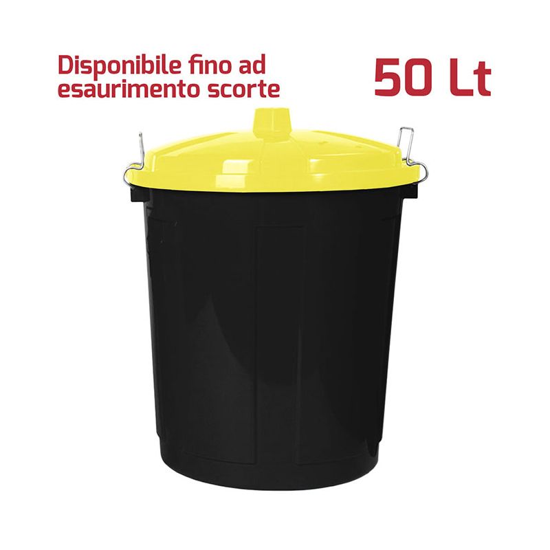 Bidone Big 50Lt in PP nero con coperchio giallo e chiusure in metallo. Pratico bidone utile sia in ambienti professionali che domestici e adatto sia all'uso esterno che interno: ideale per la spazzatura, per la cura dell'orto o del giardino. Le chiusure in metallo assicurano che i rifiuti e gli odori rimangano all'interno e fungono anche da maniglie per facilitare il trasporto del bidone. Il materiale in cui è realizzato rende il bidone resistente, duraturo e facile da pulire grazie alla superficie lucida. Grazie alla vasta gamma di colori e le diverse capacità sono ideali anche per la raccolta differenziata.
